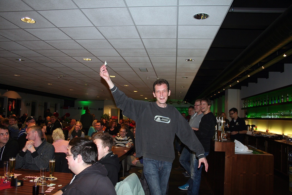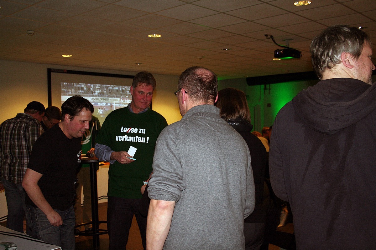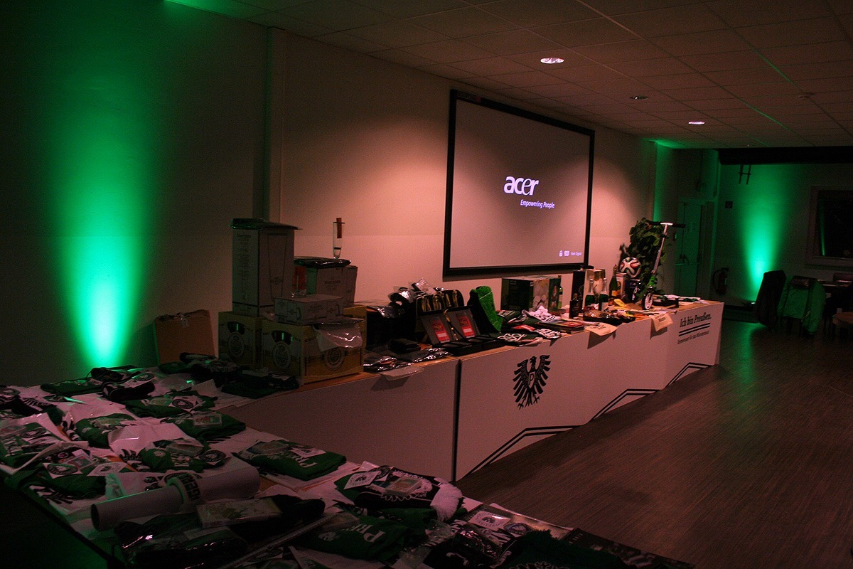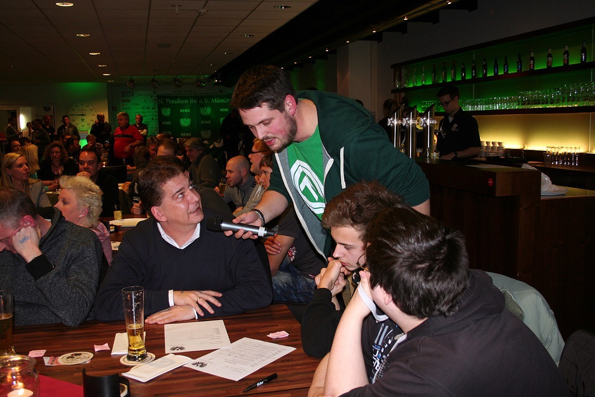 Ein Programm gab es selbstverständlich ebenfalls. Angefangen bei einem Preußenquiz, bei dem die einzelnen Tische gegeneinander um 5 Kästen Bier antraten. Dort konnte man sein Preußenwissen mit dem der anderen messen. Eine sehr nette Idee waren übrigens die Multimedia Spiele wie beispielsweise „Tor oder kein Tor“. Der Höhepunkt des Programms bestand aber aus der Tombola. Vor Beginn des Abends war es möglich sich Lose zu kaufen und selbst unser Trainer Ralf Loose war sich nicht zu schade persönlich die restlichen Lose unters Volk zu bringen. Dies war nebenbei bemerkt auch nötig, da die erste Fuhre an Losen bereits nach einer halben Stunde verkauft waren. Angemerkt sei hier noch, dass der Erlös aus dem Losverkauf komplett gespendet wurde. Der Hauptpreis war ein schwarz-grüner Cityroller. Aber auch die anderen Preise waren nicht ohne, reichte es doch von einer Jahreskarte für den Allwetterzoo Münster bis hin zu einem Fußball, Fanpaketen und sogar einem nagelneuen Trikot. Einziger kleiner Wermutstropfen war, dass das Programm so voll war, dass der gesamte Abend eigentlich fast nur aus Programm bestand und es außer in den kurzen Pausen zwischendurch kaum Gelegenheit gab sich mal mit anderen Fans zu unterhalten, sofern diese nicht gemeinsam mit einem selbst am Tisch saßen. Aber dieser Punkt war ebenfalls zu verschmerzen, gab es doch im Anschluss an das offizielle Programm noch die sehr gelungene Aftershow-Party.