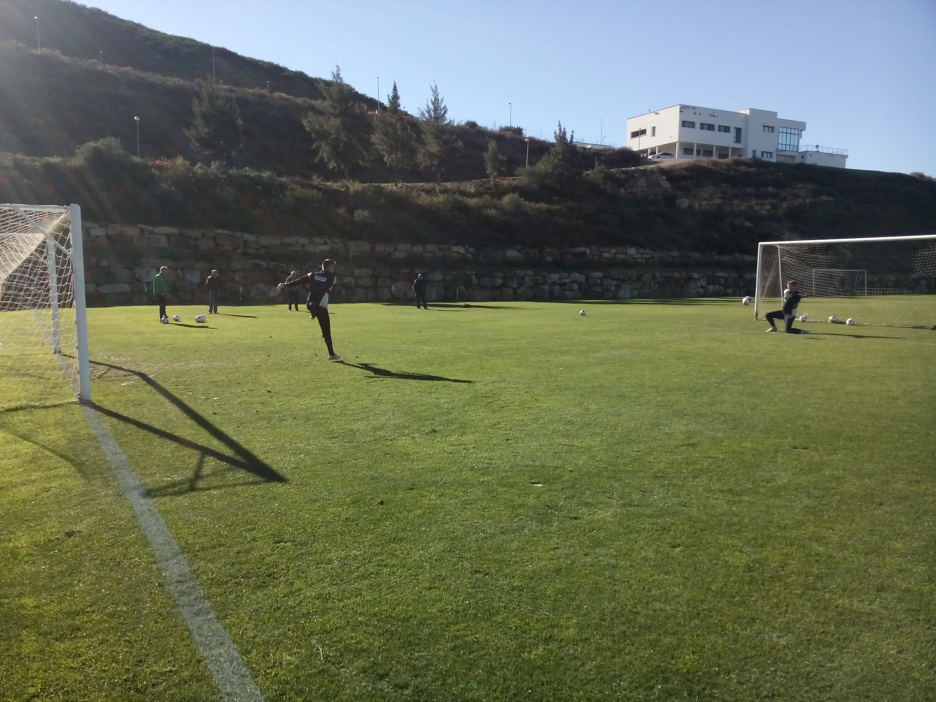 Pünktlich zur zweiten Trainingseinheit am Tag sollte ich laut Navi dann auch am Trainingsplatz ankommen. Sollte ich. Bin aber über eine halbe Stunde später erst eingetroffen. Gut, mir wurde zwar im Vorfeld gesagt, dass man dem Platz nicht finden würde, aber dass der so versteckt ist, konnte ja niemand ahnen. Also fuhr ich nach der Umgehungsstraße auf einer verlassenen Palmenprommenade einen Berg hoch. Nichts, außer leerstehender Gebäude und nicht vollendeter Rohbauten – aus Zeiten der jüngsten Immonilienkriese in Spanien – ebneten mir dem Weg. Da fühlte ich mich schon auf der korrekten Route, bis aufeinmal das Navi sagte, dass ich angekommen sei. Doch da war nichts… Half ja nichts, also bin ich halsbrecherisch ein Pättcken runter gefahren und nach zwei engen Kurven sah ich sie dann in schwarzen Leibchen, unsere glorreichen Jungs fleissig am Trainieren. Den kurzen aber bestimmenden Anweisungen unseres Cheftrainers lauschte auch das mitgereiste Präsidium, sitzend auf einer Bierbank am Seitenrand. Super Idee hatte ich mir gedacht und habe mich dazu gesellt. Boah, aber da zog es trotz Sonnenplatz wie Hechtsuppe. Also zurück zum Auto und Pulli wie Sommerjacke drüber. Das ging dann schon gut, doch nach über einer Stunde wurde es so auch recht kühl, sodass meine Hände bei den Interviews für Radio Mottekstrehle schon bibberten.