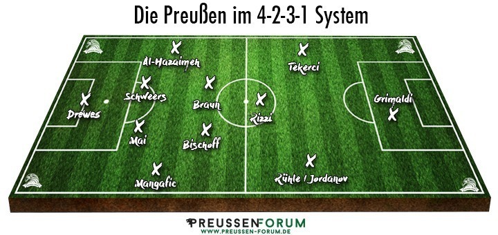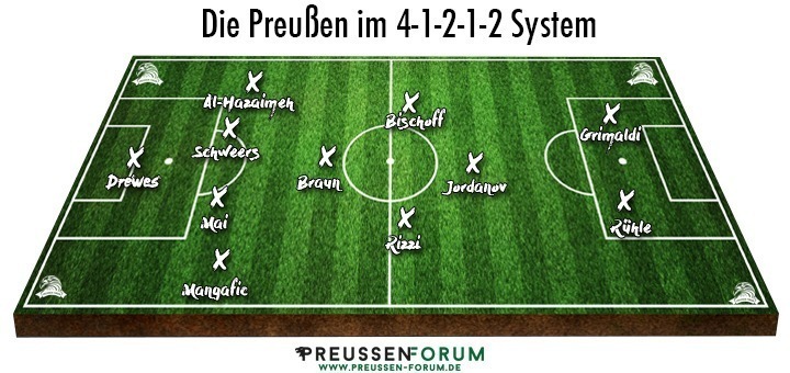 Neben dem 4-1-2-1-2 mit einer Raute im Mittelfeld ist auch ein klassisches 4-4-2 mit einer „flachen Vier“ denkbar. Dies bedeutet, dass die vier Mittelfeldspieler nahezu auf einer höhe agieren, wenngleich die Flügelspieler ein wenig weiter in der Offensive ihre Akzente setzen sollten. Das Sturmduo und die Abwehr als Viererkette blieben dabei unverändert. Lediglich in der Zentrale dürften Braun, Bischoff und Rizzi um zwei Plätze kämpfen und dahinter lauert schließlich noch Danilo Wiebe.