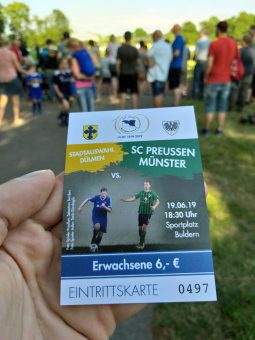 Ungefähr alle 10 Jahre kommt der SC Preußen Münster für ein Spiel nach Dülmen. Am letzten Mittwoch war es dann wieder einmal soweit. Gegner war eine Stadtauswahl aus Dülmen, aber der eigentliche Gegner und Grund war ein anderer. Die Adler aus Münster besuchten die Adler aus Buldern. Anlass war der 100. Geburtstag der dortigen Heimmannschaft, der DJK Adler Buldern. Lustigerweise trägt diese als Logo, wie der SCP vor 13 Jahren zum Hundertjährigen, die sogenannte „Taube“. Und auch die alten Sitzschalen aus dem Preußenstadion waren vor Ort anzutreffen.